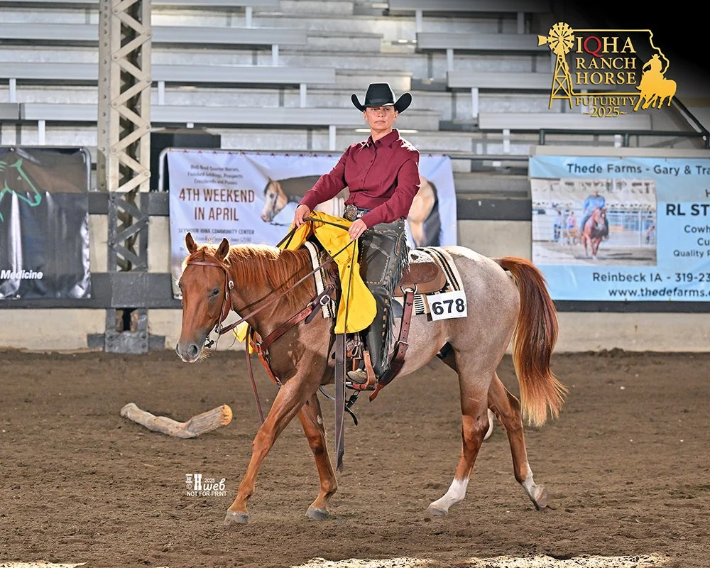 2024 sorrel filly. Bowmans Fancy Queen - full sibling to our 2025 gelding Just Playin. Exhibited at IQHA Ranch Horse Futurity in 2025. Placed 5th under one judge in in-hand trail, top 15 under all three judges for in-hand trail out of class of 61. Looking forward to starting her under saddle in 2026. Nomination paid/current in Riata, NRCHA Stallion Incentive, and IQHA Ranch Futurity.